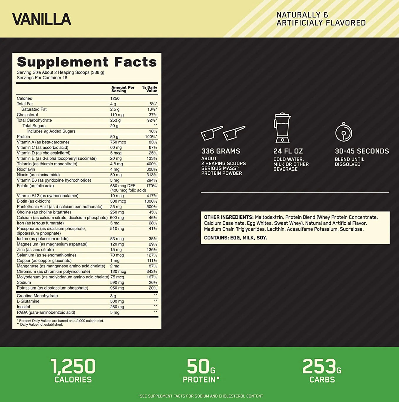 OPTIMUM NUTRITION Serious Mass powder supports muscle building, weight gain, and helps fuel workouts with up to 1260 calories, 50g of protein, up to 253g of carbohydrates, and 5g of creatine monohydrate in every serving 1,7– all in a convenient shake for easy consumption. This value-priced bundle contains two 12lb. tubs and allows you to choose two of 5 great tasting flavors.