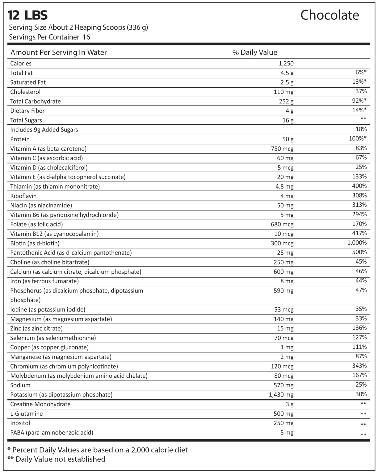 - The full dose of 2 scoops of 336 grams contains 1250 calories, 50 grams of protein, 252 grams of carbohydrates, and only 4.5 grams of fat. It also contains 3 grams of creatine monohydrate.